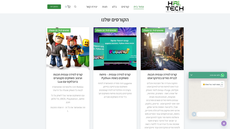 קורס למידה עצמית תכנות לבניית מודים במיינקראפט | קורס למידה עצמית – פיתוח משחקים בשפת Python | קורס למידה עצמית תכנות ועיצוב משחקים מקצועיים ברובלוקס עם Lua | קורס למידה עצמית ליצירת Mincecraft Plugins ב-Java | קורס למידה עצמית של JavaScript באמצעות מיינקראפט | קורס למידה עצמית תכנות בסקראץ’- קורס תכנות לילדים בגילאי 7-10 תכנות משחקים בעזרת בלוקים | קורס פיתוח בוטים לשרת דיסקורד – JavaScript, Node.js | קורס למידה עצמית בניית עולמות Minecraft באמצעות תכנות