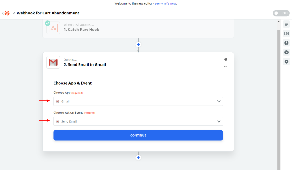 שלב 4: כאשר תבחר באפשרות Webhooks by Zapier תראה את האפשרות לבחור נקודת טריגר > תפוס את ה-RAW Hook ולחץ על CONTINUE.