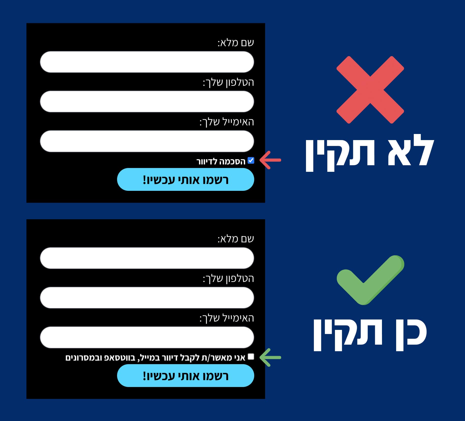 לאחרונה אני שם לב לדפי נחיתה עם טופס לידים בו תיבת הסימון שבו הלקוח מאשר לקבל דיוור שהיא כבר מסומנת מראש ואני מבין את הרצון לחסוך ללקוח שלב ולוודא שהוא נרשם לדיוור אבל חשוב להבין שברמה המשפטית הלקוח צריך לסמן את התיבה בעצמו אחרת הוא יכול לתבוע אתכם ולטעון שלא שם לב שנרשם לדיוור ושזה היה מסומן מראש ושהוא לא הסכים לזה בעצמו.